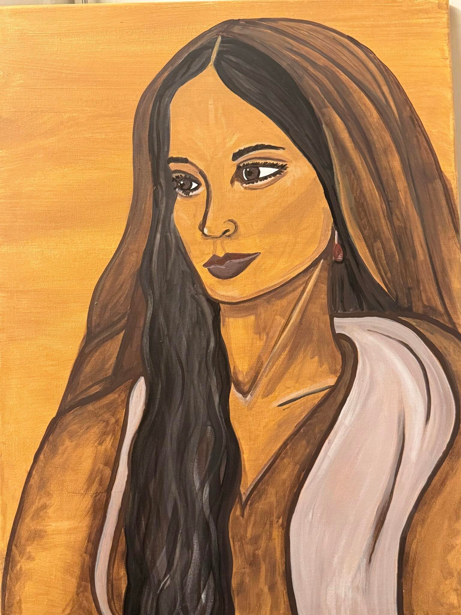 Warm, earthy, and full of quiet power, this striking portrait brings timeless presence to any space. Painted in golden tones with rich black and umber detailing, she evokes strength, calm, and ancestral energy whether you see her as a memory or a mystery.